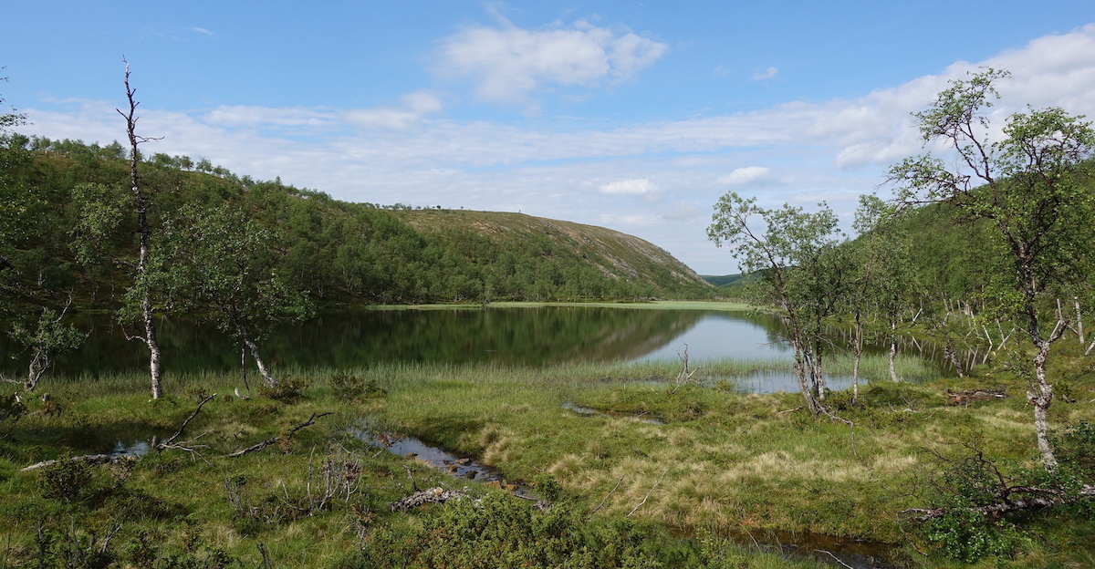 Keli oli aamulla parempi, sade oli yöllä helpottanut. Lähdimme jatkamaan kohti Jeageloaivijärveä. Taivas oli pilvessä, mutta keli oli vaellukseen oikein mukava. Kuljimme korkeuskäyrää järven suuntaan.