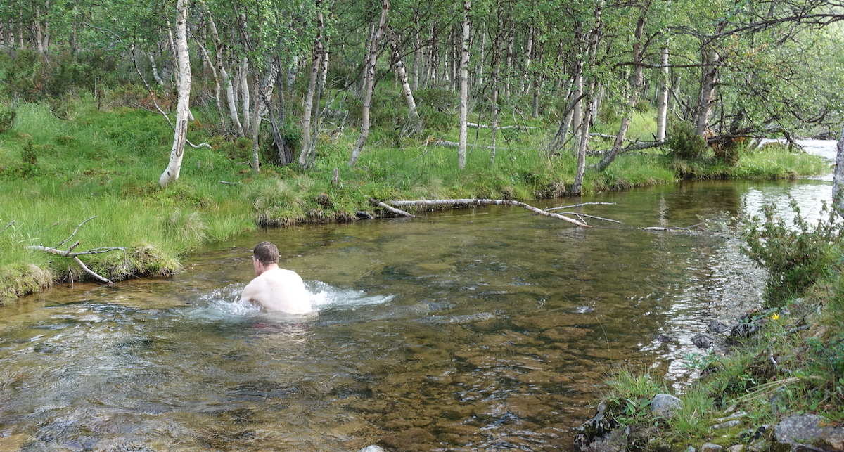 Vesi valitettavasti avasi Villen Compeedin ja jouduimme ottamaan pysähdyksen paikkauksen ajaksi. Janne kävi sillä välin uimassa purossa, joka oli paikoin aika syvä. Vesi oli kylmää ja virkisti kuumaa päivää kivasti!
