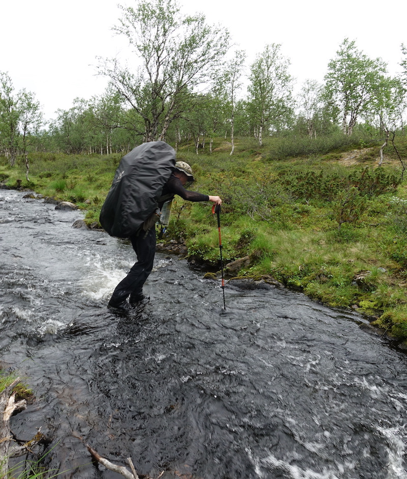 Ylityspaikka oli tosiaan mainio ja pääsimme helposti yli. Päivä alkoi olla jo aika lämmin, kun jatkoimme kohti Muotkan Ruoktua, jonne olisi vielä n. 9km. Sää muuttui koko ajan hikisemmäksi ja ötököitä riitti! Mutta reitti oli mukavaa ja helppokulkuista. Yksi mielenkiintoinen puron ylitys osui puolimatkaan, mutta siitä päästiin kivien yli hyppimällä.