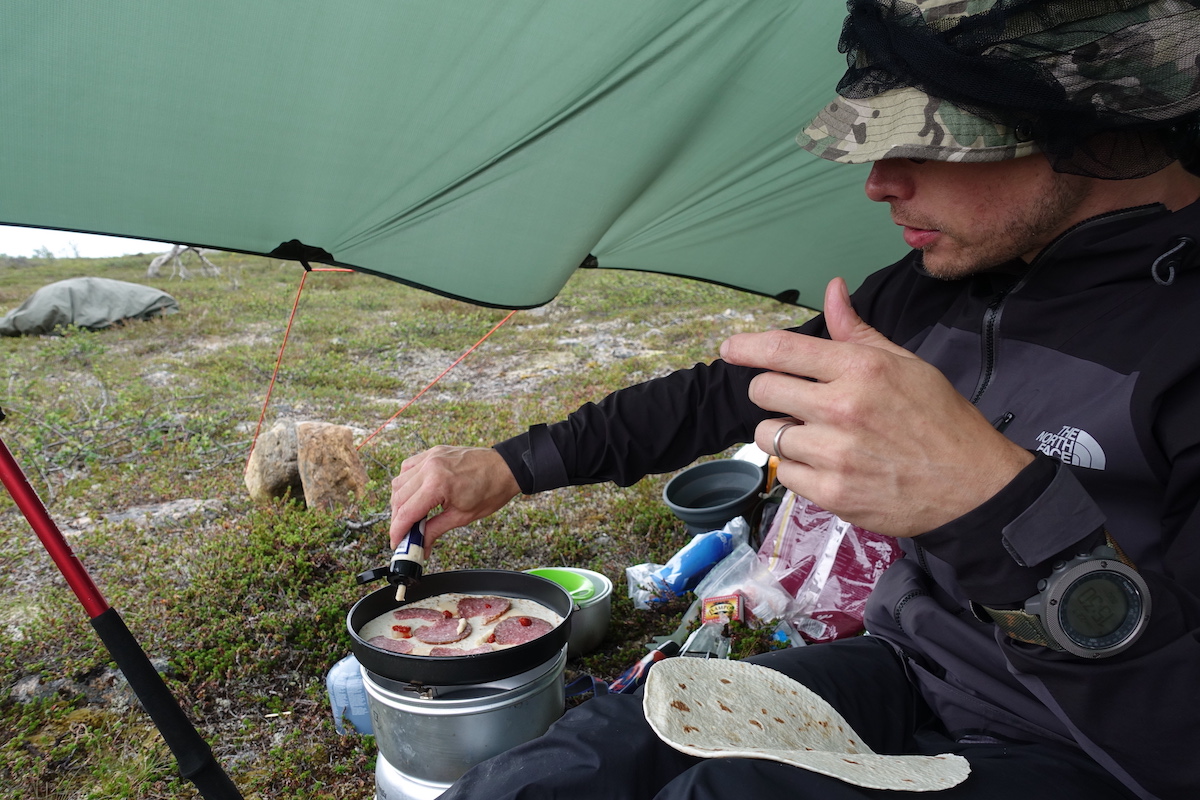 Keli oli tässä vaiheessa parantunut ja aurinkokin vilahteli välillä. Poroja kulki tarppimme ohitse useita pikkutokkia. Tuuli oli kova, mutta tarpin alla Janne pyöräytti meille maasto-fajitakset Trangian pannulla