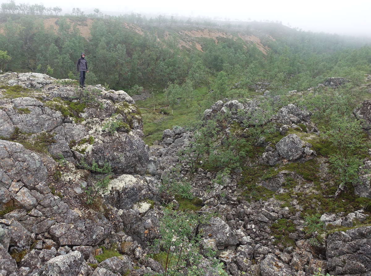 Joelta lähdimme nousemaan ryteikköisempää ja koskeampaa maastoa kohti Piekanaäytsiä. Hikeä pukkasi, ilma oli seisovaa, ötököitä riitti. Pääsimme 1,5km nousun jälkeen taas puurajan yläpuolelle. Poroja oli alueella paljon. Pidimme lounastauon pieneksi kuivaneen uoman reunalla.