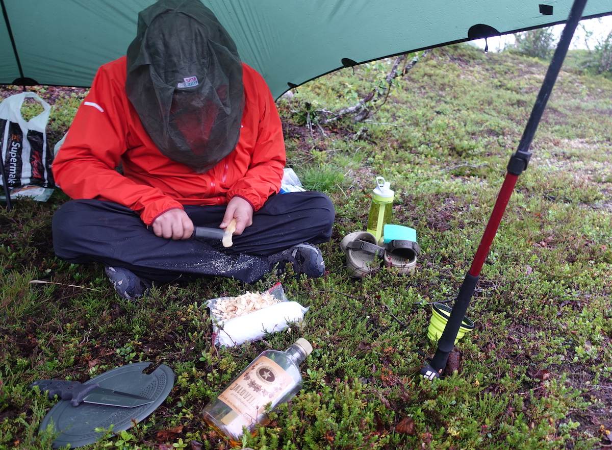 Ville veisteli kuivaneesta katajanoksasta Trangia-lastan. Muoviset eivät koskaan kestä, meidän Light-my-fire-luha oli hajonnut on ensimmäisessä leirissä. Ville paikkaili rakkojaan ja Janne keitteli ruokaa.
