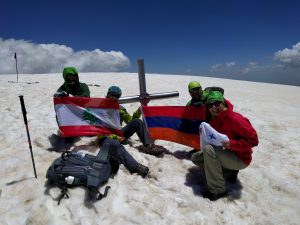 Saavutimme lumipeitteisen huipun parin tunnin kipuamisen jälkeen. Näkymät olivat upeat joka suuntaan! Tarjosimme libanonilaisille matkakumppaneillemme Sisu-pastilleja huiputuksen kunniaksi.
