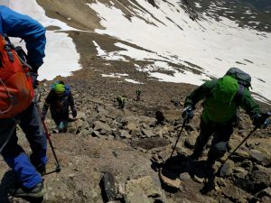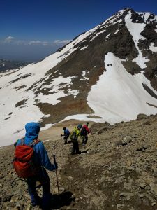 Sää oli niin hyvä ja ryhmän mieliala ja kunto korkealla, että päätimme huiputtaa vielä viereisen läntisen huipun, joka oppaamme mukaan on 4010m (Wikipedian mukaan 3995m). Laskeuduimme alas n. 100-200m vertikaalisesti ennen muutaman sadan metrin nousua uudelleen. Tässä rinne oli jyrkempi, kiveä ja irtosoraa oli paljon enemmän. Kokematon kiipijä sai katsoa askeleensa varsin tarkasti.